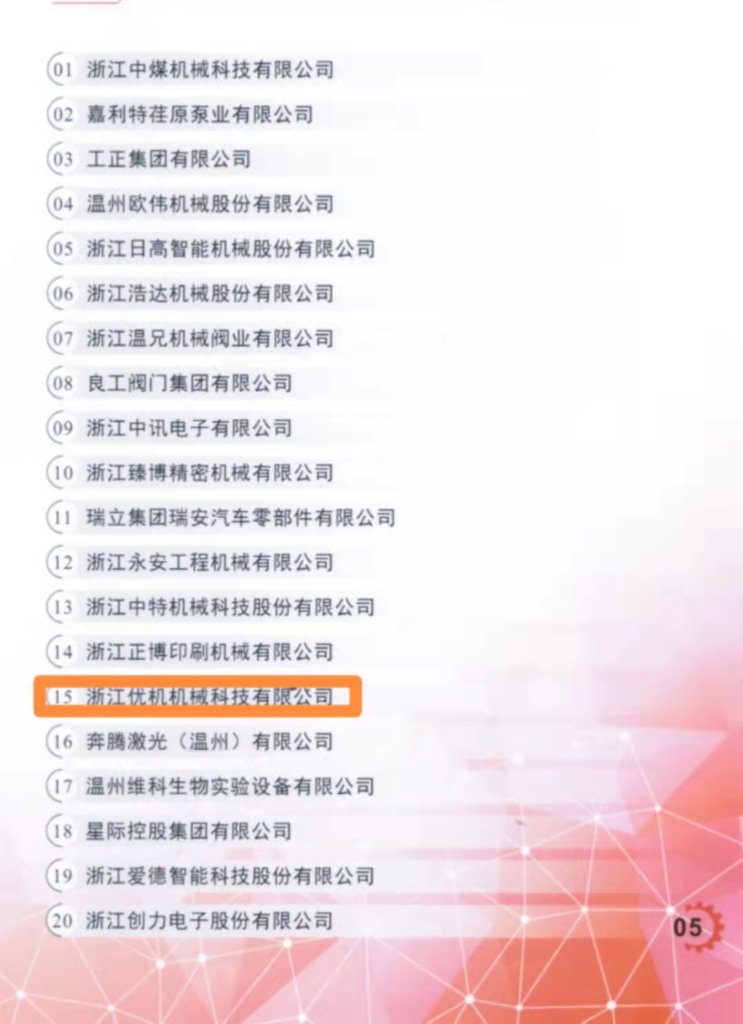 浙江優(yōu)機機械科技有限公司 在溫州市智造業(yè)高質(zhì)量發(fā)展大會入榜溫州好產(chǎn)品智造新勢力光榮榜,主辦單位溫州市經(jīng)濟和信息化局。
